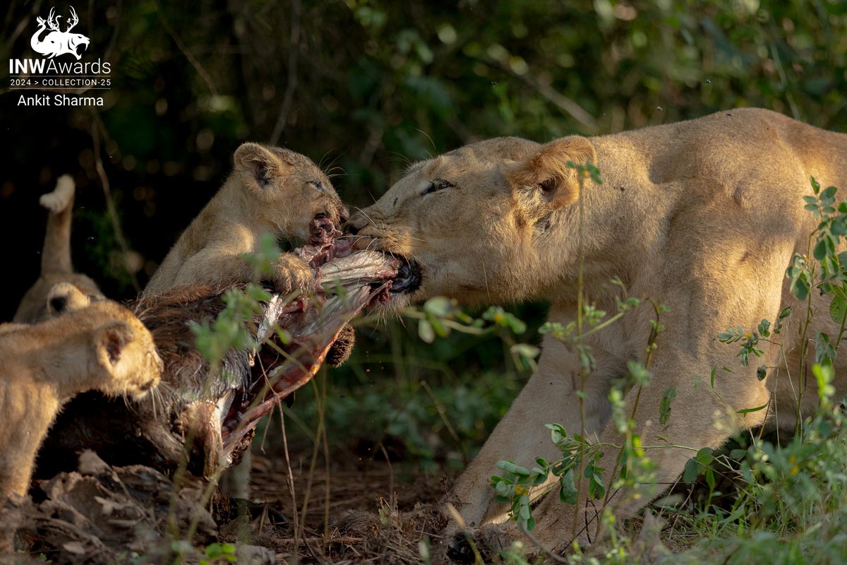Cubs showing the strength. : Lions cubs sharing food with her mother showing the strength the have and this is the sign of young prince.