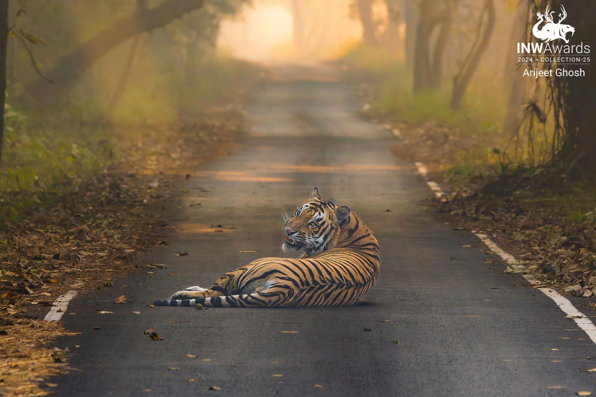 A moment when everything I wanted, actually came together! We had been exploring the beautiful Terai region of Pilibhit Tiger Reserve in thick fog come early morning when I had started visualising the perfect photo that I could have clicked in this landscape. As the jungle awakened with the sun rays lightly piercing through the fog and then through the tall Sal trees, I imagined what it would be to find a tiger in the middle of the road with all the elements coming together: the fog, the filtered sunlight, the golden hour, the famed “pakki sadak (tar road)” and the most royal subject of course: the Bengal Tiger. And luck. Within few minutes of the Safari, we bumped into this beautiful sub-adult male in the middle of the road, who gave us a grumpy look the moment our gypsy stopped near him. I imagine what he must be thinking "Woke me up from my sleep, you bloody tourists".