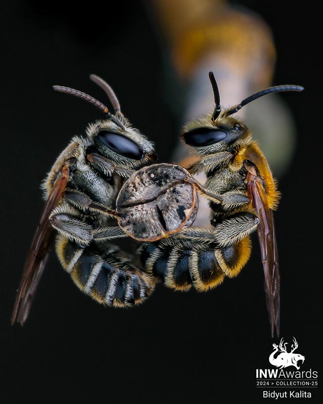 Title: "Harmony in Nature's Symphony" Description: In the enchanting landscapes of Goalpara, Assam, where nature unfolds its myriad wonders, I found myself immersed in a moment of pure magic. Within the hollow confines of a dry bamboo stick, a secret world unveiled itself—a captivating scene that encapsulated the delicate dance of life and beauty. Gently, I approached the bamboo stick, drawn by a mysterious energy emanating from within. As I peered, my eyes widened in awe. There, nestled within the narrow confines, I discovered a pair of Nomia sp. bees, adorned in striking hues of dark brown and black, accentuated by vibrant golden bands that adorned their sleek bodies. Nomia bees, native to this diverse region, stand as remarkable representatives of nature's ingenuity. These tiny creatures, belonging to the family of sweat bees, play an indispensable role as diligent pollinators. Unlike their honey-producing counterparts, Nomia bees dedicate their existence to nurturing the intricate balance of the natural world. In this captured moment, the remarkable sight of two Nomia bees facing one another within the confinements of the bamboo stick invoked a sense of harmony—a testament to the interdependence that governs our natural world. It was a delicate encounter, a shared connection that transcended boundaries and showcased the essence of unity. Through this photograph, I invite you to witness the intricate beauty of nature's interwoven threads. It serves as a reminder that every creature, no matter how small, plays an extraordinary part in the grand symphony of life. Let us embrace and cherish these unsung heroes of the wild, safeguarding their habitats so that they may continue their invaluable work, weaving their delicate magic in the tapestry of our shared existence.