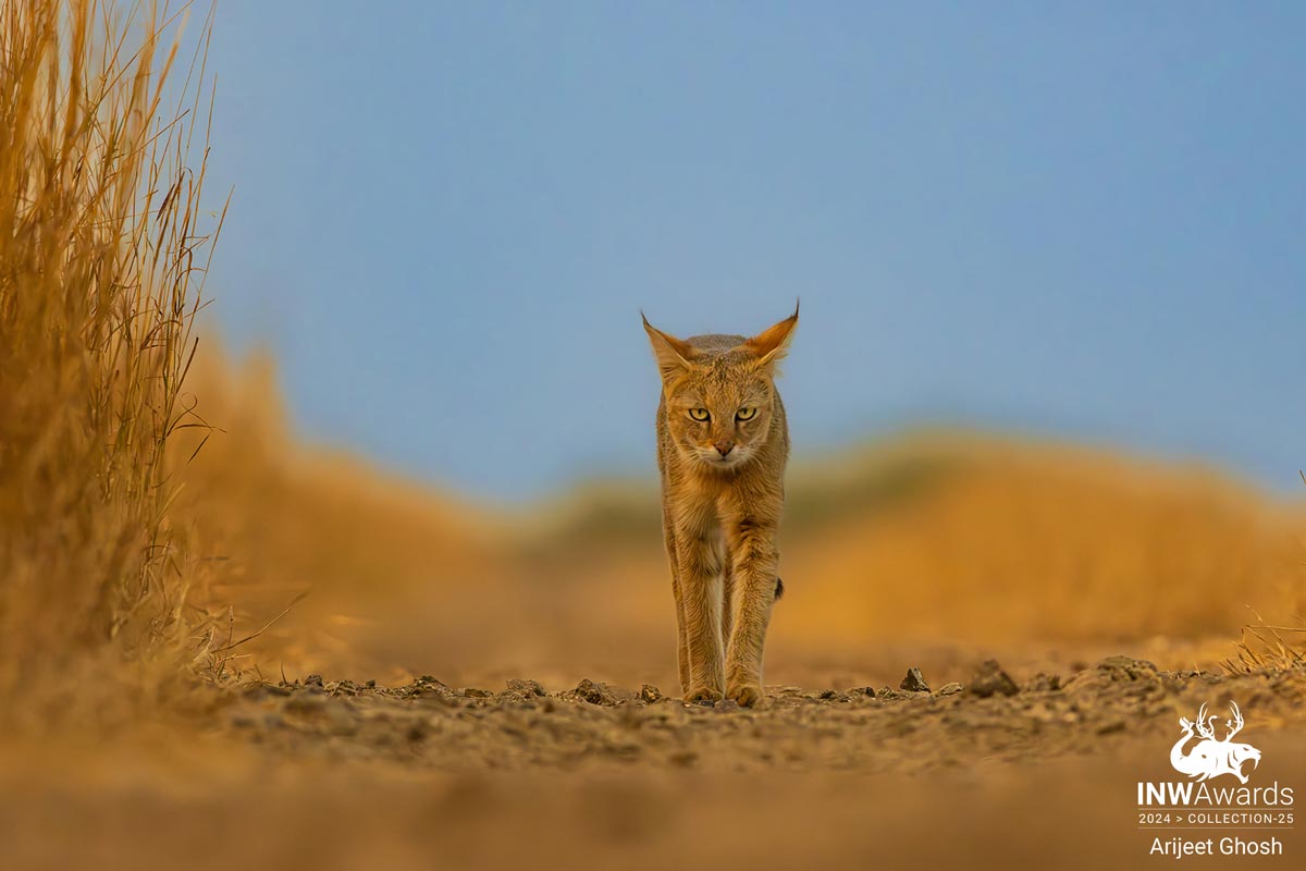 In any wild cat photography, some of the most beautiful shots that are clicked are the ones that are clicked head-on. I mean, why not? The elegance and grace of these beautiful creatures are on full display when they walk head-on: the eye contact, their stride, and the colours of their coat- absolutely gorgeous! In my very first safari in Blackbuck National Park in Velavadar, we had passed by two jungle cats, who true to their nature bolted as soon as they saw us. But this cat turned out to be something special. Anticipating the cat’s behaviour, we went to the opposite side of the road, where a watchtower existed. We got down near the watchtower (the only place we could get down from the car), and hoped that if she walks towards us, we had good chances of getting ground-level head-on shots of her! And bang on. With beautiful evening golden light falling on her, she unbothered, moved head-on towards us. She became so comfortable that she passed by us within a 2-3ft distance, going about her scan and hunt! This surely counts as one of my most intimate moments with wildlife, one that I will cherish forever!