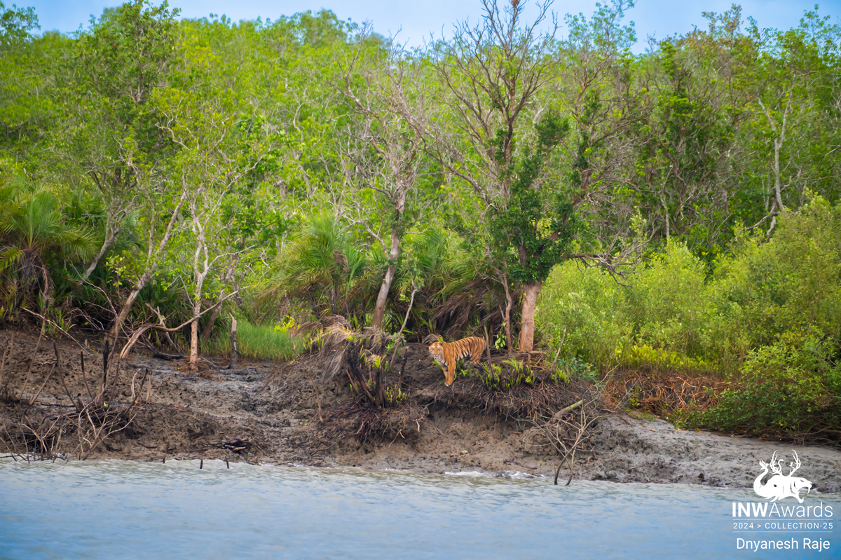 I have captured a beautiful picture from the vast Sundarbans forest, which is home to large mangroves. During my day-long safari, I spotted a variety of birds and raptors, but unfortunately did not catch a glimpse of any tigers for the first three days. However, on the last day, during the final hour, our operator showed us a stunning moment. Instead of taking a close-up shot, we decided to take a habitat shot of the Sunderban Tiger, where we captured the water, sky, and tiger with the Mangroves forest in the background.