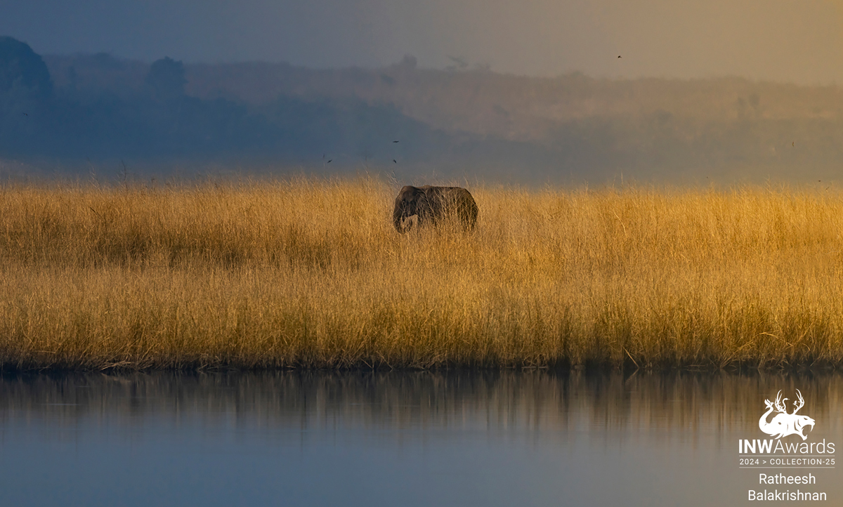 Location : Jim Corbet National Park - Dhikala Zone Date : January 2024 Year 2024 started with a golden step for my wildlife passion. I was planning a short vacation to escape my busy corporate life in Kuwait. Finally, the plan ended with a trip to Jim Corbett National Park, the first national park of India. On 25th January, I stepped into Dhikala for a safari and a three-day jungle stay. Dhikala was incredibly beautiful, with the Ramganga River, golden grasslands, and misty mornings in January. All of these factors created an amazing wild landscape for the zone. On our last day, the Par area (a zone across the Ramganga River) was open, and we traveled there, hoping for some tiger action near the Ramganga River zone. It was a misty morning, with the sun showering its golden light, attempting to eliminate the mist. In the distance, I saw an elephant grazing amidst the golden grass, and I took a few clicks of the frame. The frame was blessed with the Ramganga River as the foreground and the partially misty atmosphere. It became one of my favorite frames gifted by Dhikala that morning.