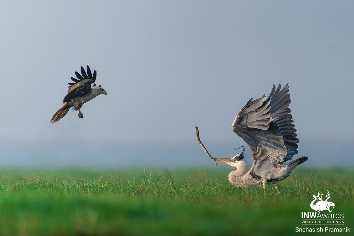 IN THIS IMAGE A GREY HERON TEASING A BRAHMINY KITE WITH HIS SNAKE CATCH. THE HERON WAS ENJOYING HIS LUNCH UNTIL THIS KITE ARRIVES AND TRIES TO SNATCH IT. THIS IS ONE OF THE DREAM SHOTS WHICH I WITNESSED IT IN FRONT OF MY EYES. THIS SHOT COMPLETED MY MANGALAJODI TOUR WHICH IS KNOWN FOR ITS ACTION SHOTS. SHOT AT MANGALAJODI WETLANDS, ODISHA. SONY A7IV WITH 200-600G OSS LENS