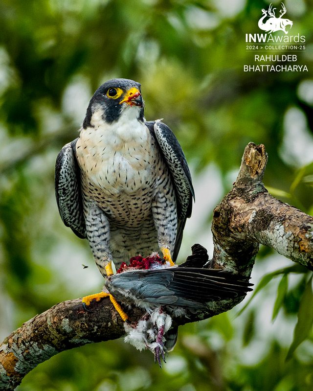 We had just ventured out for our day's safari early in the morning,when our sleepy eyes caught sight of a large bird dancing on the head of a leafless tree.On approaching it closely,we found a majestic Peregrine Falcon enjoying it's early morning breakfast.The moment remained in our cameras and minds forever. Peregrine Falcon with kill Sundarban Tiger Reserve,West Bengal,India March 2024