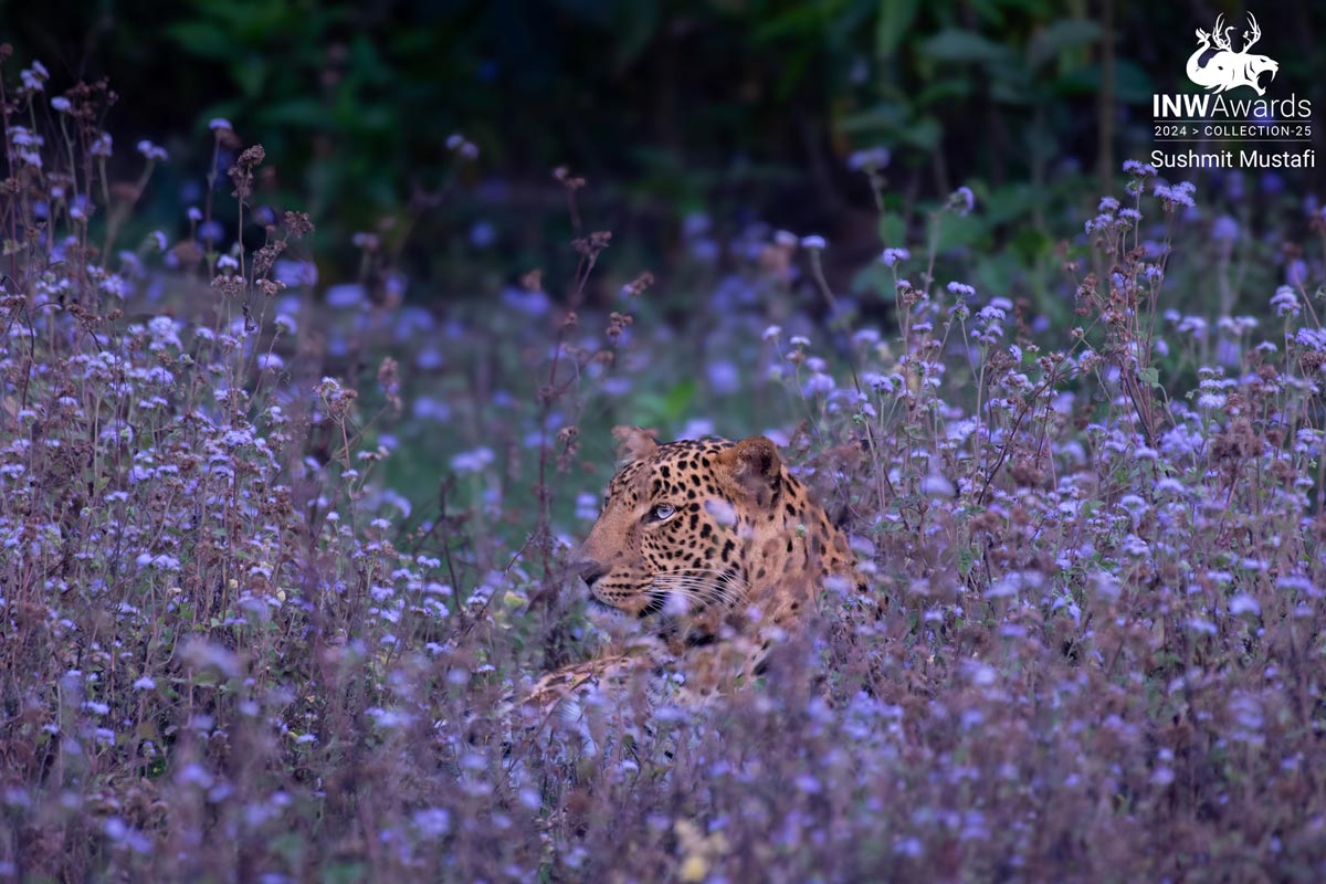 A male leopard rests after a meal on a beautiful bed of blue mink flowers. Clicked at Rajaji National Park, March 2024