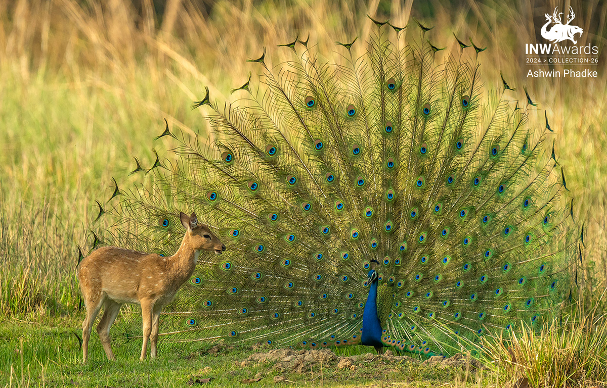Indian Peafowl in full display of its magnificent train to a bewildered spotted deer. Captured at Kanha National Park, India, May 2023. We were on a hot summer morning safari in the Mukki zone and were waiting patiently for Dhawajhandi Tigress to emerge with her cubs. Meanwhile, this peacock was incessantly displaying its train of feathers to this spotted deer who was going about its business without much amusement. It was a very unique interaction that I was fortunate to capture.