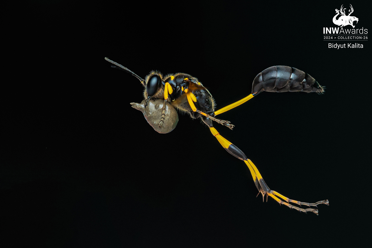 Witness the enchanting moment captured in this photograph, where nature's drama unfolds. A Sceliphron wasp, a solitary architect of mud nests, takes to the air, its wings ablur. Gripped firmly in its stinger, a motionless spider dangles, a testament to the wasp's hunting prowess. This image embodies the delicate harmony of nature, as the vigilant wasp ensures balance by controlling spider populations. With grace and purpose, it transports its prey towards the nurturing embrace of its nest, sustaining its own lineage. In this fleeting scene, we glimpse the profound beauty of nature's interconnectedness. The predator-prey relationship, eternally intertwined, reminds us of the intricate choreography of survival. Location - Goalpara, Assam.