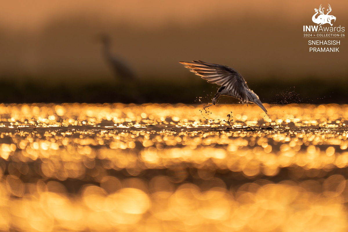 WHISKERED TERN SHOWCASING A VICTORY POSE AFTER CATCHING A FISH. AND THIS BOKEHS OF GOLDEN LIGHT ON WATER FILLING THE FRAME WITH A PLEASING AMBIENT ELEMENT, WHILE THE WATER DROPS SHINING LIKE SPARKLES ENHANCED THE OVERALL FRAME. SHOT AT MANGALAJODI WETLANDS, ODISHA. SONY A7IV WITH 200-600G OSS LENS