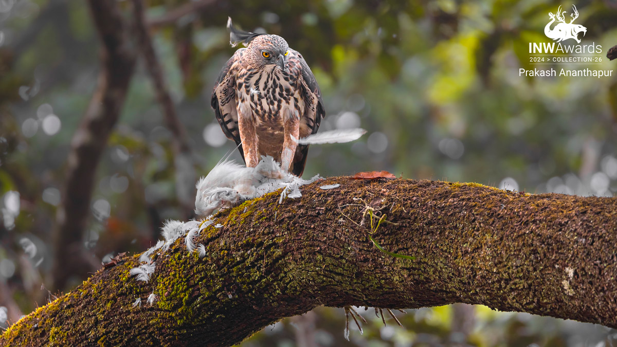 A morning feast : The white feather's of the egret on the forest road was the only way we could notice this Raptor on the tree perch, busy with it's morning kill. This changeable Hawk eagle was spotted and photographed at Bhadra Tiger Reserve, Karnataka.