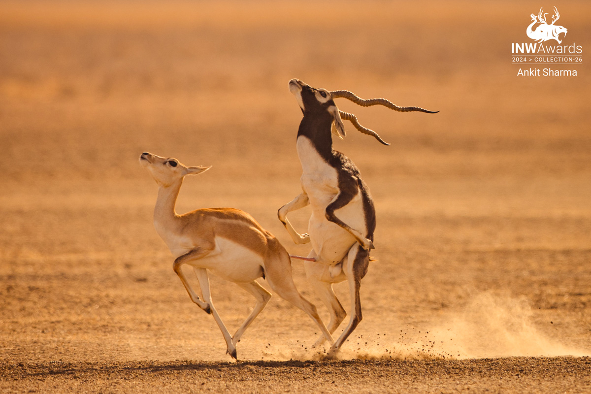 Mating Moments : The blackbuck has white fur on the chin and around the eyes, which is in sharp contrast with the black stripes on the face. The coats of males show two-tone colouration; while the upper parts and outsides of the legs are dark brown to black, the underparts and the insides of the legs are all white. Darkness typically increases as the male ages; females and juveniles are yellowish fawn to tan