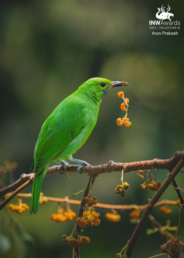 In this striking photograph, a vivid green bird perches gracefully on a branch, caught in an "oops" moment as it drops a cluster of orange berries from its beak. The vibrant colors of the bird's plumage and the berries contrast beautifully against the soft, blurred background, creating a captivating snapshot of nature's delicate and unpredictable moments. This image perfectly captures the fleeting and charming details of wildlife.