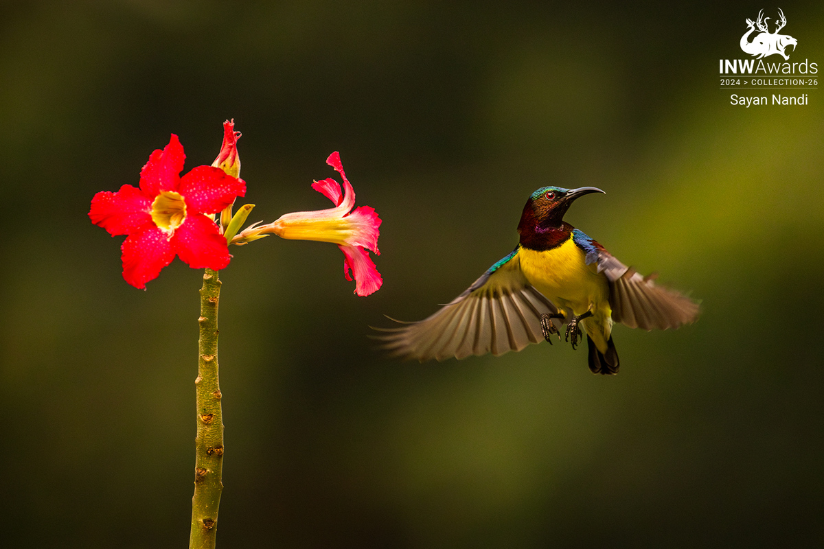 A strange behavior of male purple-rumped sunbird. It was flying toward the flower to collect its nectar and then suddenly it looked other way towards a female sunbird hearing its call. The picture was taken in Nadia district of West Bengal on November,2023