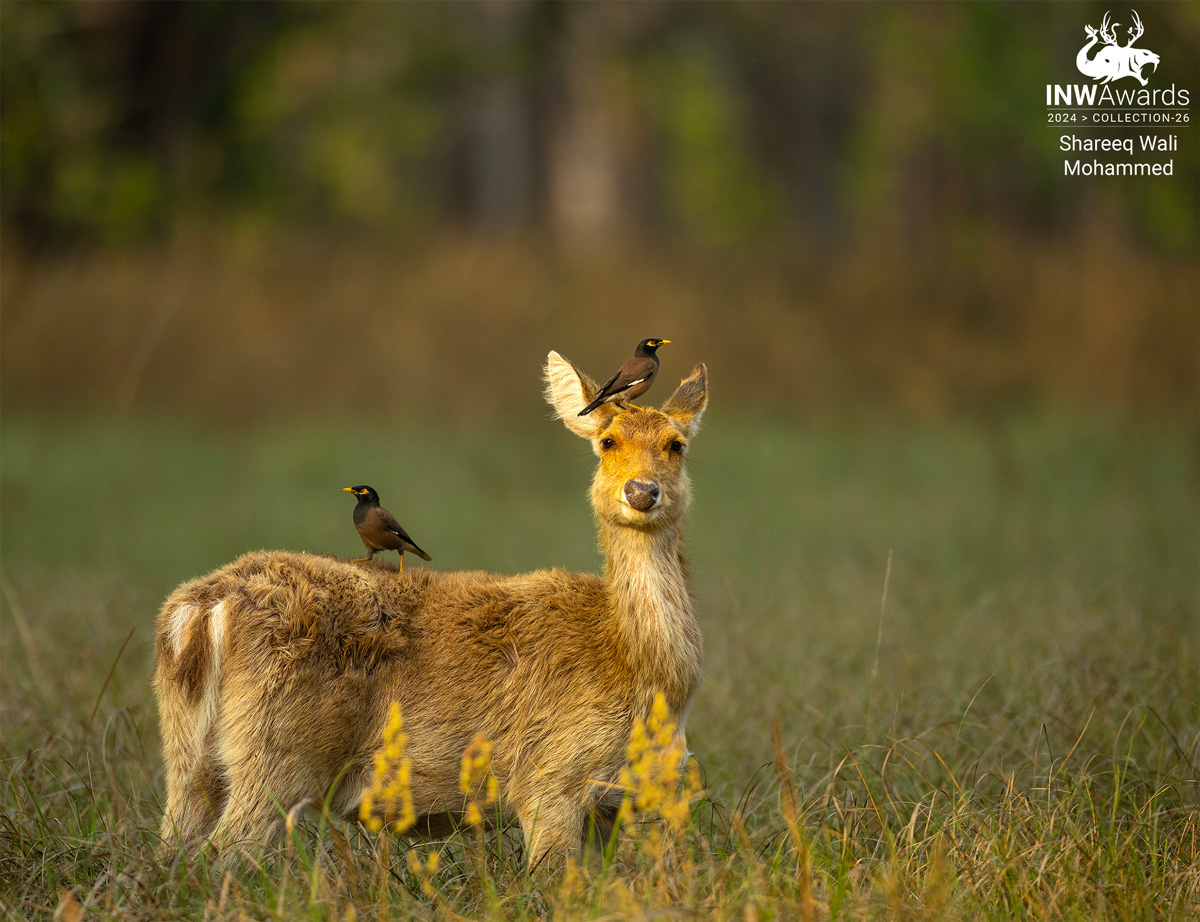 Harmony! The harmonious relation between Barasingha and common myna is a simple yet incredible example of sustainable forest life and the species that live tunefully. These curious pair of mynas were seen enjoying a feast of ticks, insects from the furry coat of swamp deer and perhaps providing a spa treatment to the latter in chorus. This scene was observed during the morning golden hour in the lush green grasslands of Kanha National Park.