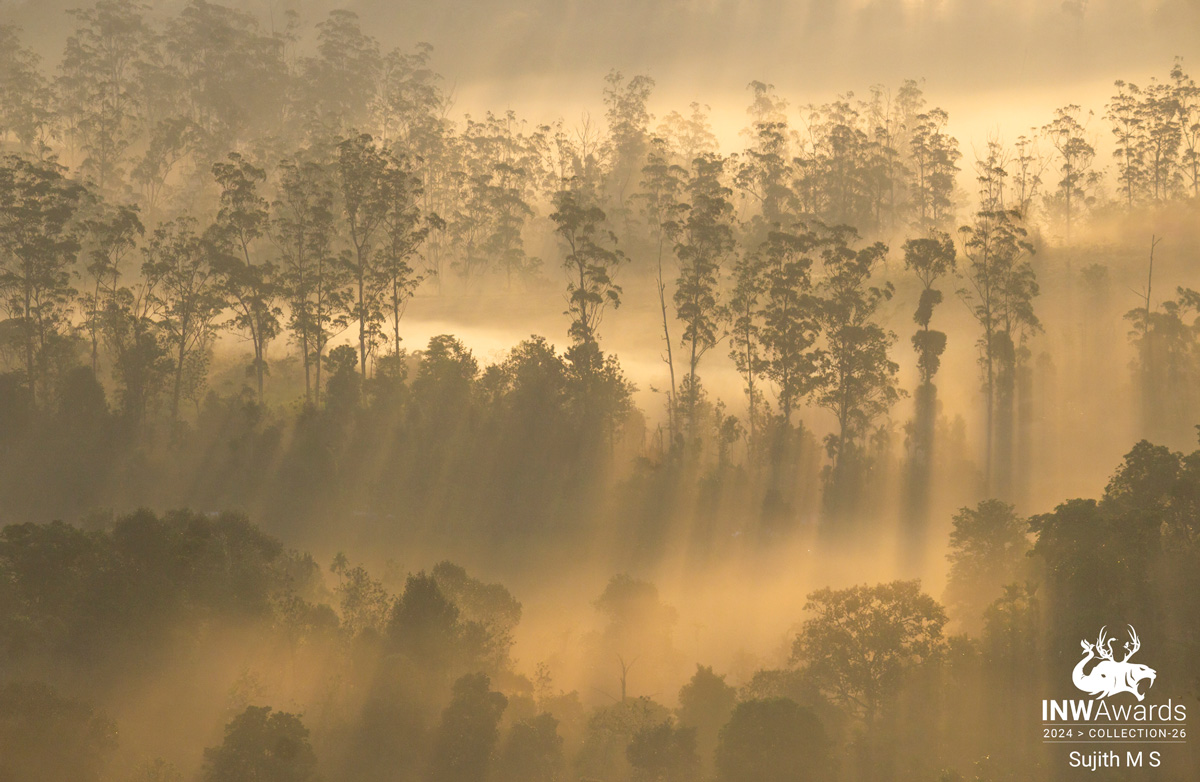 Nature's Dance in Magical Rays: A heartwarming sight greeted me as I beheld the forest veiled in a gentle blanket of fog. The soft golden rays of the early morning sun danced through the layers of the landscape, casting enchanting shadows that added depth and magic to the scene. From Nilgiris , Tamilnadu on April 2022