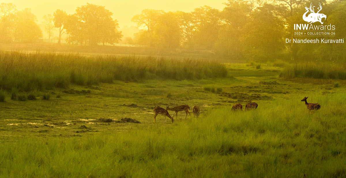 The Golden mist After the scorching heat wave, Tadoba woke to a misty morning. Sunbeams fought through the fog, turning the forest into a golden maze. Rain-washed clean, the air smelled of earth and awakening plants. A herd of spotted deer emerged, their coats gleaming like jewels. Cautiously, they stepped out, then nosed through the undergrowth, their return echoing the forest's renewal. The rising sun watched, casting a golden glow over the scene.