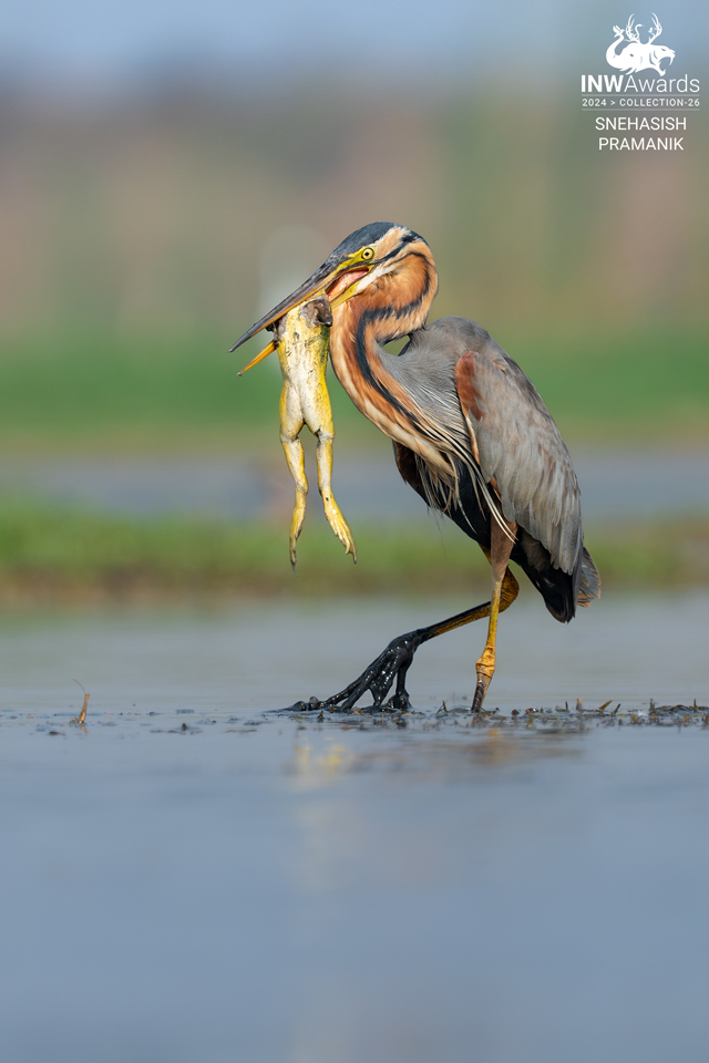 PURPLE HERON CARRYING A HUGE FROG IN ITS BEAK, AS WELL AS GIVING A PERFECT BODY POSE WHICH IS COMPLEMENTING THE FRAME. SHOT AT MANGALAJODI WETLANDS, ODISHA. SONY A7IV WITH 200-600G OSS LENS
