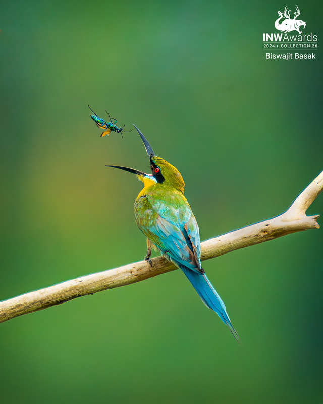 Blue-tailed bee-eater You know, being colorful is sometime becomes a curse. The insect was so colorful that the Blue-tailed bee-eater chose it as it's prey. It was quite big for the small bird but you know predator are predators, no matter what's the size. It was scorching hot outside and this Blue-tailed bee-eater was busy to find it's food. All on a sudden I heard some metallic sound of closing something. I turned my head I found that yes it's the sound of the beak of Blue-tailed bee-eater fetching it's food. It was trying to rearrange the position so that it can swallow it properly. I was really luck to the nature to witness this small natural phenomenon.