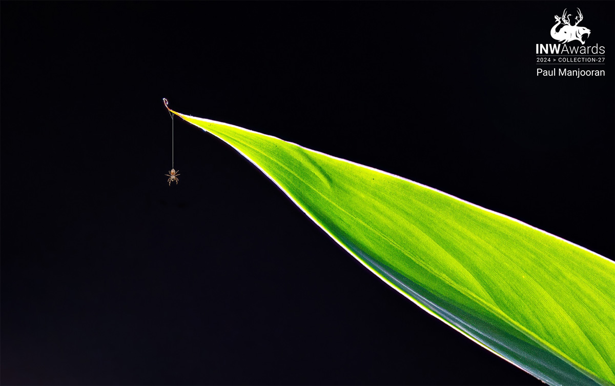 "The Trapeze Artist and the Thread of Life" In this captivating photograph, a tiny spider becomes a trapeze artist, hanging by a single thread from the tip of a vibrant bird of paradise leaf. The stark black background accentuates the vivid green of the leaf and the intricate details of the spider, highlighting the delicate balance and fragile beauty of nature. This minimalist composition captures the essence of life's tenuous connections, inviting viewers to marvel at the small wonders of the natural world. This image was photographed in kongorpilly, Kerala, India