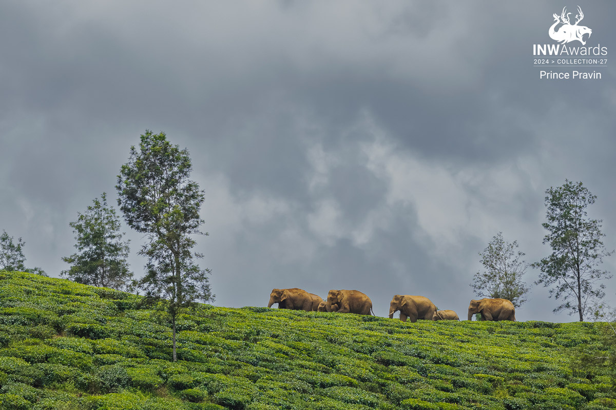 Elephants in Tea garden several tea estates located in Valparai Coimbatore District, have developed a human elephant co existance between in the tea plantations and the forest. These elephants come every year and migrate every time, one of the such beautiful sight to witness them. This picture shot on August 2023, Valparai, Tamilnadu.
