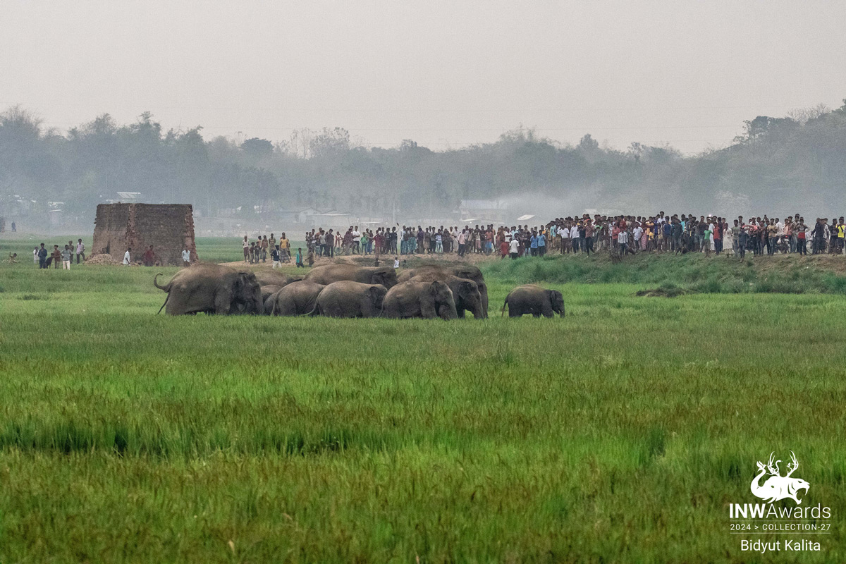 Conflict between humans and wildlife is an age old one; however, due to rapid growth of human population and subsequent reduction of natural habitat it is acute now. In Assam, every year at least 30-40 persons are losing their lives while a dozen or so elephants are killed by various reasons. The wild elephants are very much fond of ripped paddy and so they damage the crops raised by the nearby villagers. The photograph from Dhamar, Lakhipur,Goalpara Assam represents the same. A flock of wild elephants came to the ripped paddy field and the villagers were protesting them not to destroy more.