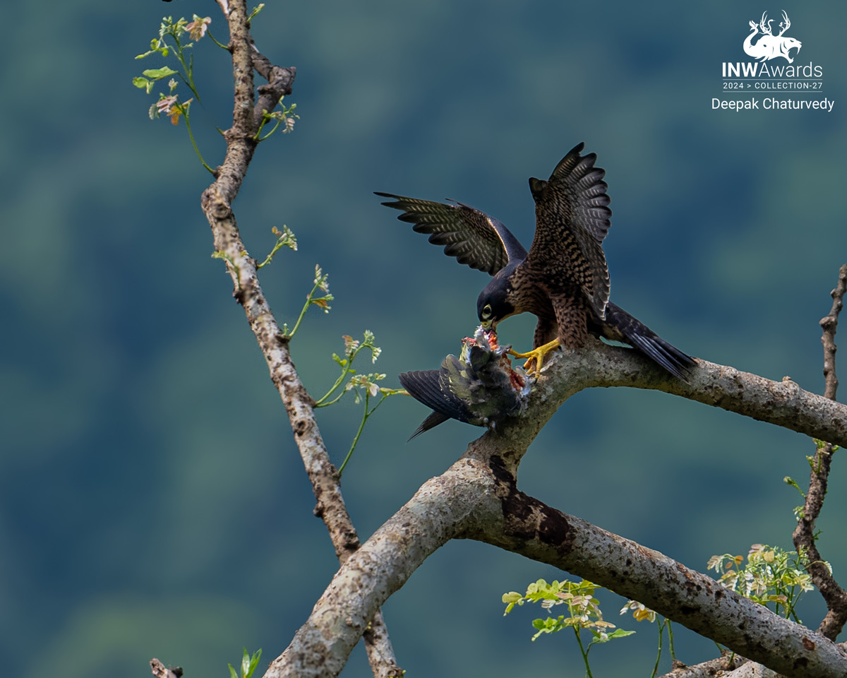Shaheen Falcon with Wedge-tailed Pigeon kill! While birding in the tea-estates of Rongtong, North Bengal I was suddenly surprised by this amazing bird of prey. It came flying in from far and sat on a barren tree branch in front of us. While he had a feast on this once beautiful Wedge-tailed Pigeon, I sat admiring the elegant and magical presence of this fearsome creation of nature. Rongtong, West Bengal - 2024