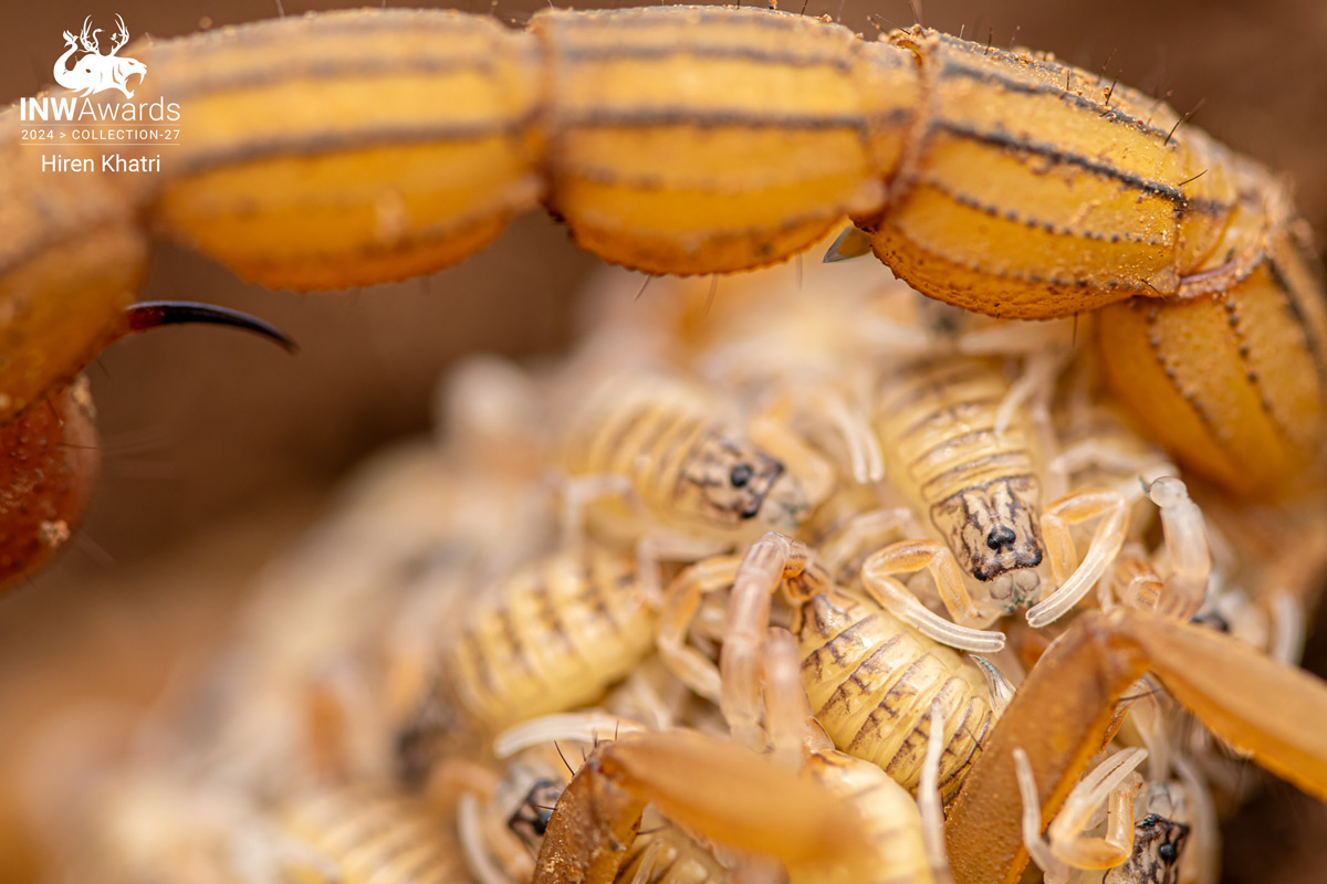 This image showcases a female Indian Red Scorpion (Hottentotta tamulus) carrying her vulnerable scorplings on her back, highlighting a vital aspect of maternal care in this species. The scorplings, initially white and defenseless, depend entirely on their mother for protection and mobility after birth. This behavior reflects the scorpion's significant parental investment, as the mother safeguards her young until they can survive on their own. Captured in north Maharashtra, the photograph offers a rare glimpse into the reproductive and developmental stages of this venomous species, emphasizing the crucial role of maternal care in the early life of the Indian Red Scorpion. This image not only reveals the intricate behavior of this misunderstood creature but also underscores the delicate balance of life and the importance of preserving even the most feared and overlooked species.