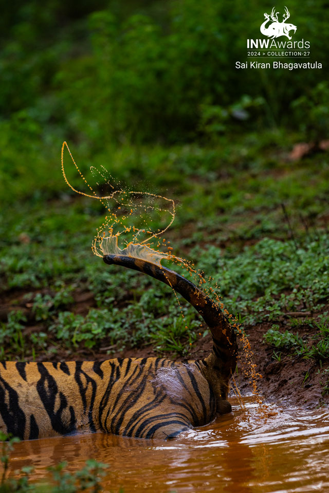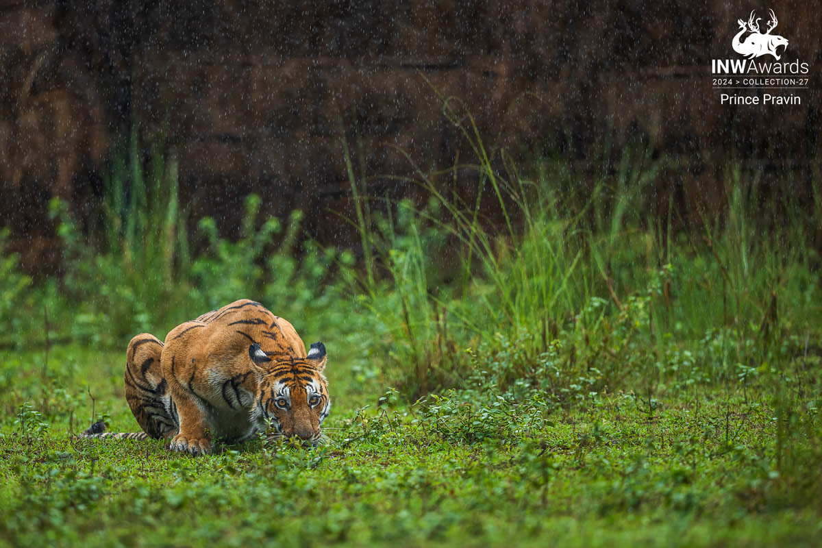 Tiger In Rain Tiger is the apex predator in India. Its presence indicate a healthy, vast and a complete ecosystem. They can survive in any kind of forest which have vast area when such vast areas will receive the normal rainfall depending on thrle geographical factors. One of the lucky day in jungle getting witnessed the Tiger in Rain quenching her thirst. This Picture shot on June 2023 on Kanha Tiger Reserve