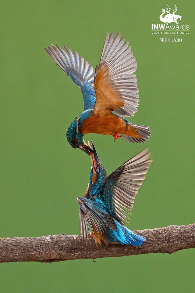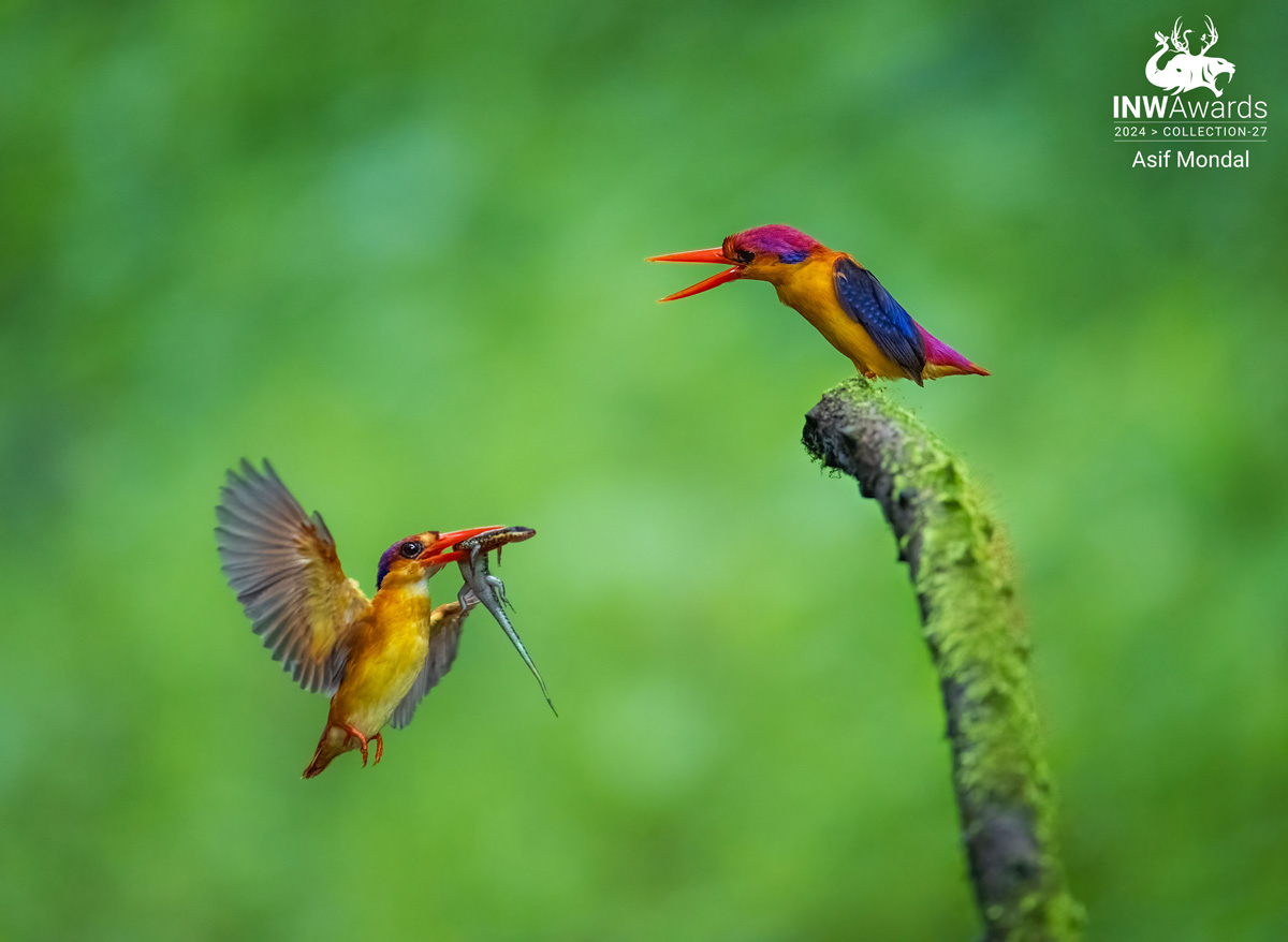 Captured at Karnala Bird Sanctuary in Mumbai, Maharashtra, this vibrant image depicts a pair of Black-backed dwarf kingfishers engaged in a feeding frenzy. The shot was taken on 29th of august 2024, during a morning visit to the sanctuary. A pair of Black-backed dwarf kingfishers, with their plumage a dazzling array of blues, oranges, and reds, were perched on a moss-covered branch. One of the birds, wings outstretched, was diving towards the moss-covered branch , its beak filled with a fresh lizard kill. The entire scene unfolded in a split second, a testament to the incredible speed and agility of these fascinating creatures. This moment of nature's raw beauty was a highlight of my visit to Karnala Bird Sanctuary. It serves as a reminder of the incredible diversity and wonder of the natural world.