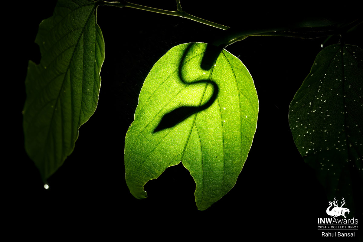 This image is of a vine snake lurking in the shadows. By placing the flashlight behind the leaves, I was able to get this frame.