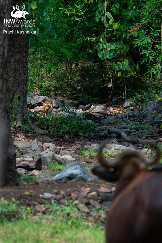 Title: The Face Off We decided to spend the last half hour of the morning drive with this tigress whom we found resting in a dry riverbed. We were casually sitting in the gypsy and watching her; unbothered by our presence she didn’t even bother lifting up her head and continued her catnap. A few moments later, a passing herd of Gaur caught her whiff. The herd slowly and cautiously moved closer to where the tigress was resting - alert, tails swishing, snorting; then came the moment when the tigress finally lifted her head and they saw each other. After a few moments of staring, the tigress put her head back down on her paws and continued to rest while the gaurs went about grazing cautiously. We had to leave soon after since we had almost run out of time. Experiencing interactions like these make game drives even more exciting. Location: Pench National Park, Madhya Pradesh - India