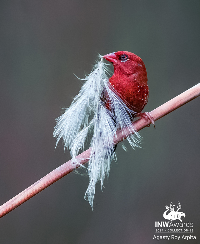 Red munia collecting nesting material ( Kans grass) West Bengal, India October 2024