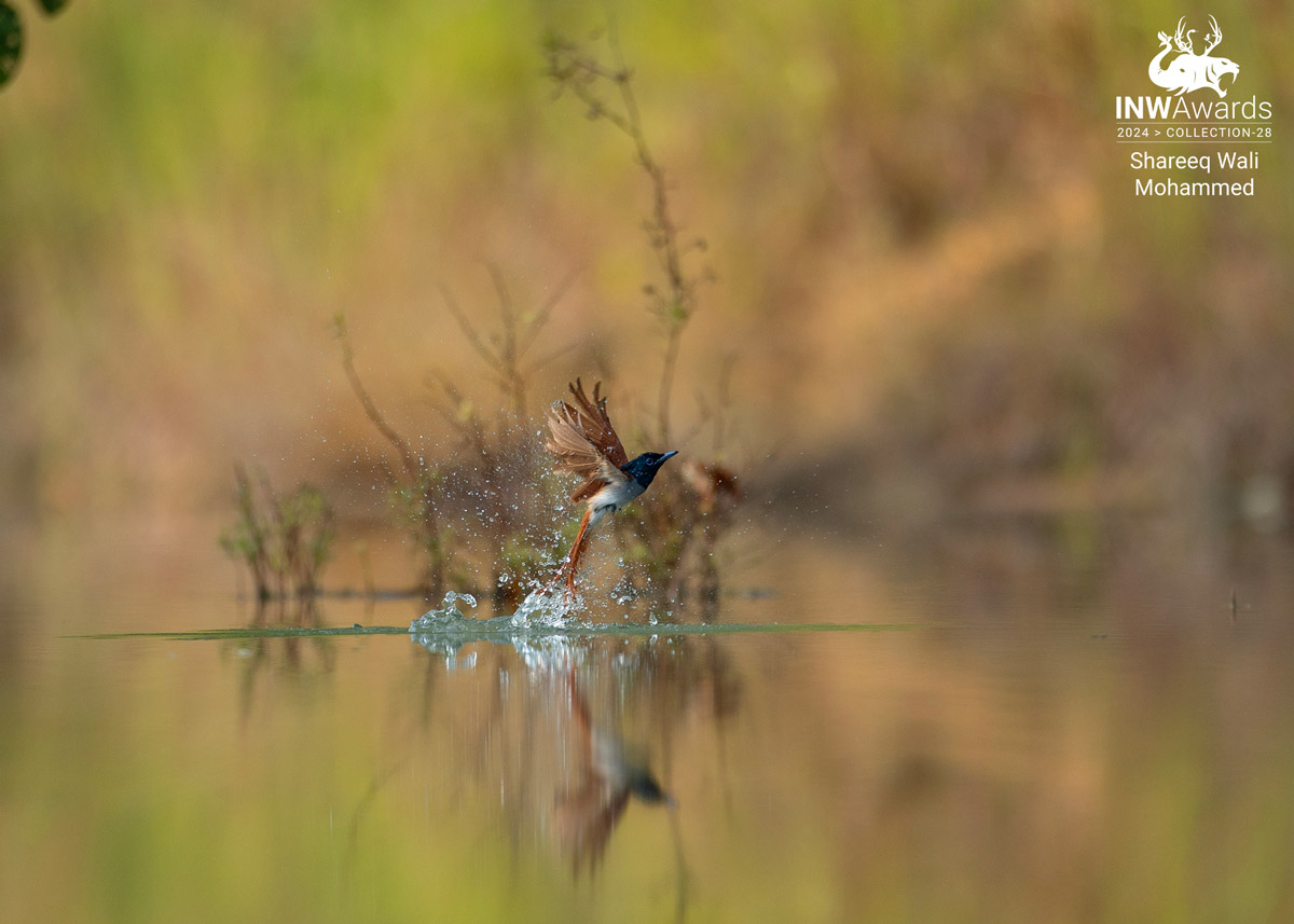 The Divine dive! They say when a Paradise Flycatcher dives, even the bird species come to a standstill and appreciate its divine dives. Every dive was scintillating to watch with water splashing all across the diving points and the mesmerizing feathers and tail waving with magical formations. This beautiful moment was observed while the waiting game was on with fresh pug marks of a tiger nearby and it was all worth in the fairytale jungles of Tadoba National Park.