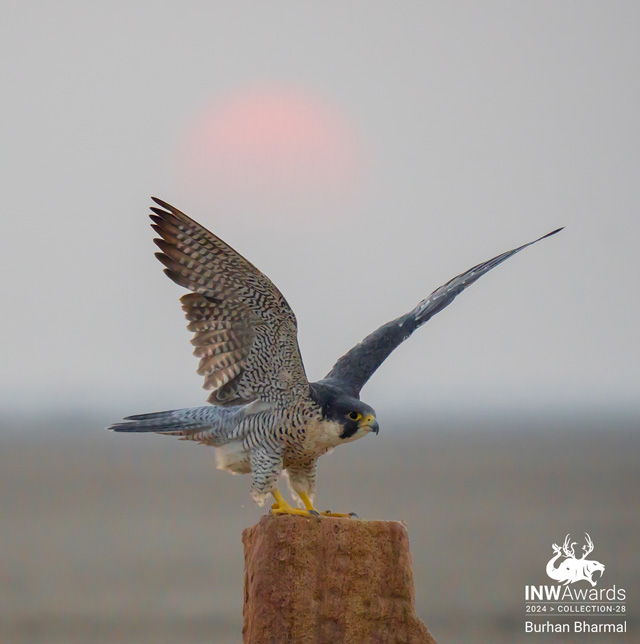 Moment before flight :I took this image in the little rann of kutch when I spotted a peregrin falcon in the distant, I sat there till the last rays of the sun hit the earth and thats when it decided to fly off, I was ready with my camera and captured this shot just as it was about to take off with the sunset behind. I captured a peregrine falcon poised on the brink of flight, the golden light of sunset . With the sun sinking low in the sky, the bird’s wings were spread, its gaze focused. In that single photograph, a bird at the height of its readiness, about to spring into action by thrusting it wings downwards. A photograph that is defined as still shows a sense of motion.