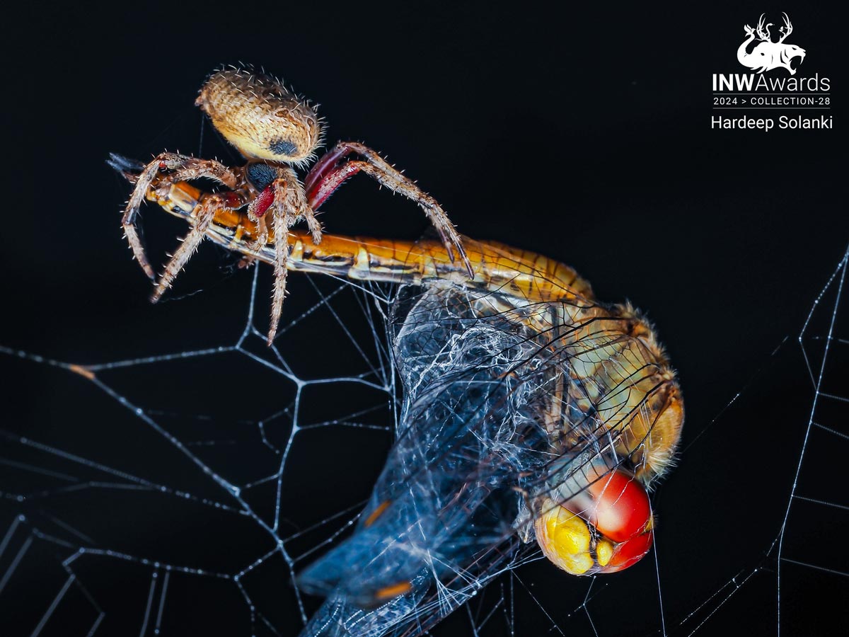 Orb weaver spider with a dragonfly caught in the web. Location - Bardoli, Surat, Gujarat