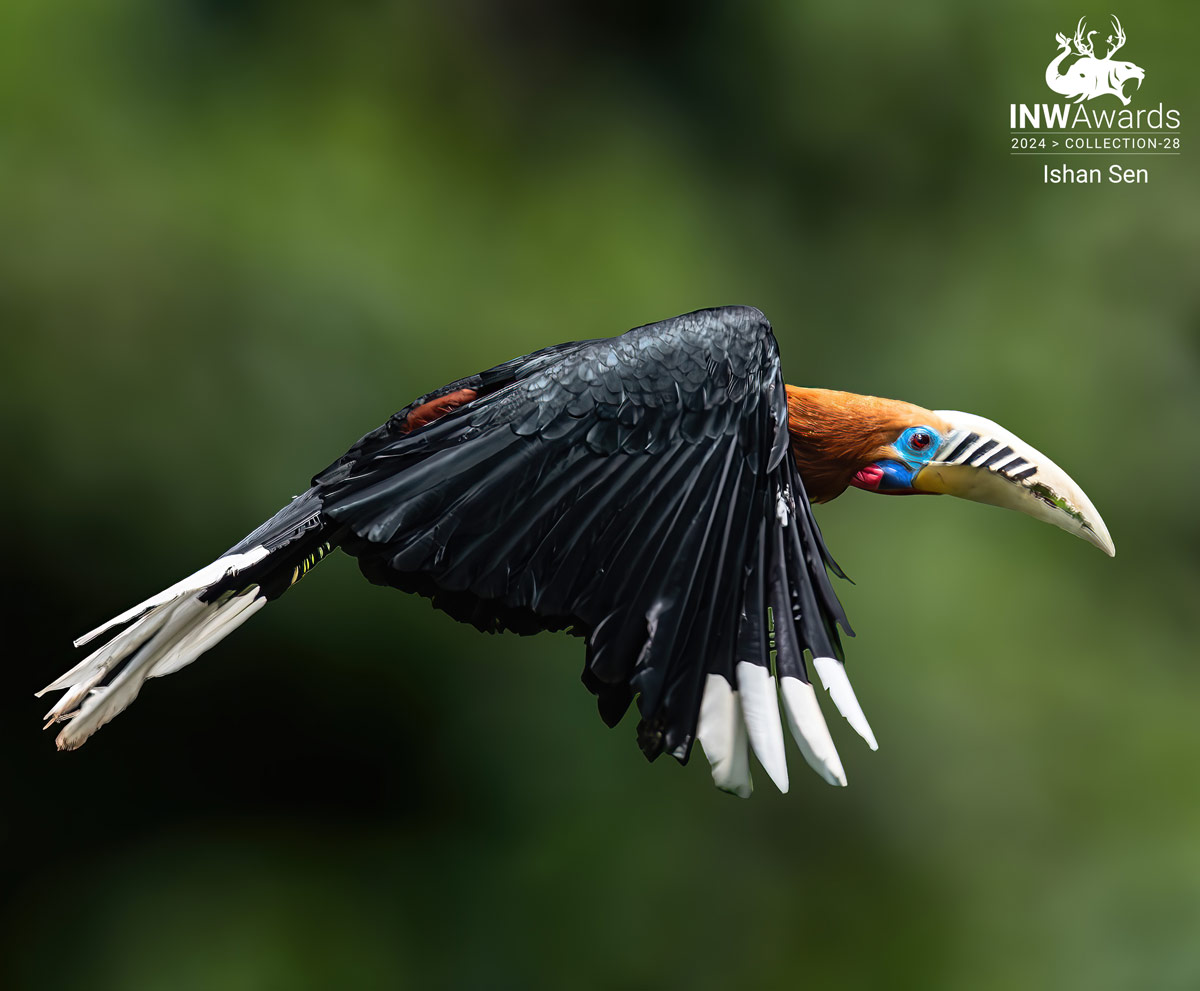 Rufous-necked Hornbill soaring through the air. This picture was taken at the hills in Rongtong, West Bengal. After a long trek downhill; I hear a 'Whoosh, Whoosh, Whoosh' sound right above my head. I had never heard something this loud coming from a bird. I then saw one of the most beautiful and rare Hornbills. It landed on a large branch. I waited for it to take flight again and as soon as it did, I clicked the shutter and managed to get this shot.