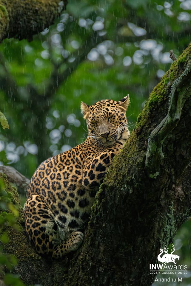 Photo of a female Leopard in the rain from Kabini Forest, Karnataka, India. I was on an evening safari in the Kabini forest, it was raining moderately and we continued to search for our luck to spot some wild animals. As we moved further into the forest we heard the alarm call by deers and stopped our vehicle and waited patiently. We were looking into the direction of the call but had no luck. After waiting some more time we moved further and luckily we spotted this beauty in the tree. What a sighting it was, my first ever Leopard sighting that too in the rain. After seeing us she was still sitting in the tree and we maintained a safe distance without disturbing her. And the rain intensity started increasing and she closed her eyes for a moment when I captured this beautiful photo, a photo in which the elusive beauty looks like sleeping in the rain.