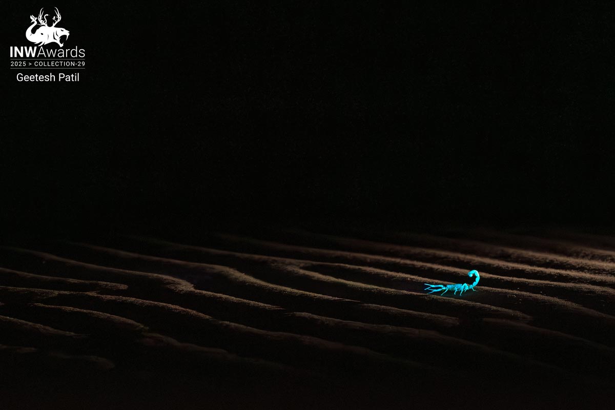 Desert Specter: Scorpion's Ethereal Glow! As night falls, the Thar Desert transforms into a realm of mystery. Desert scorpion emerges to stalk the sands of the Thar Desert glowing under UV light.
