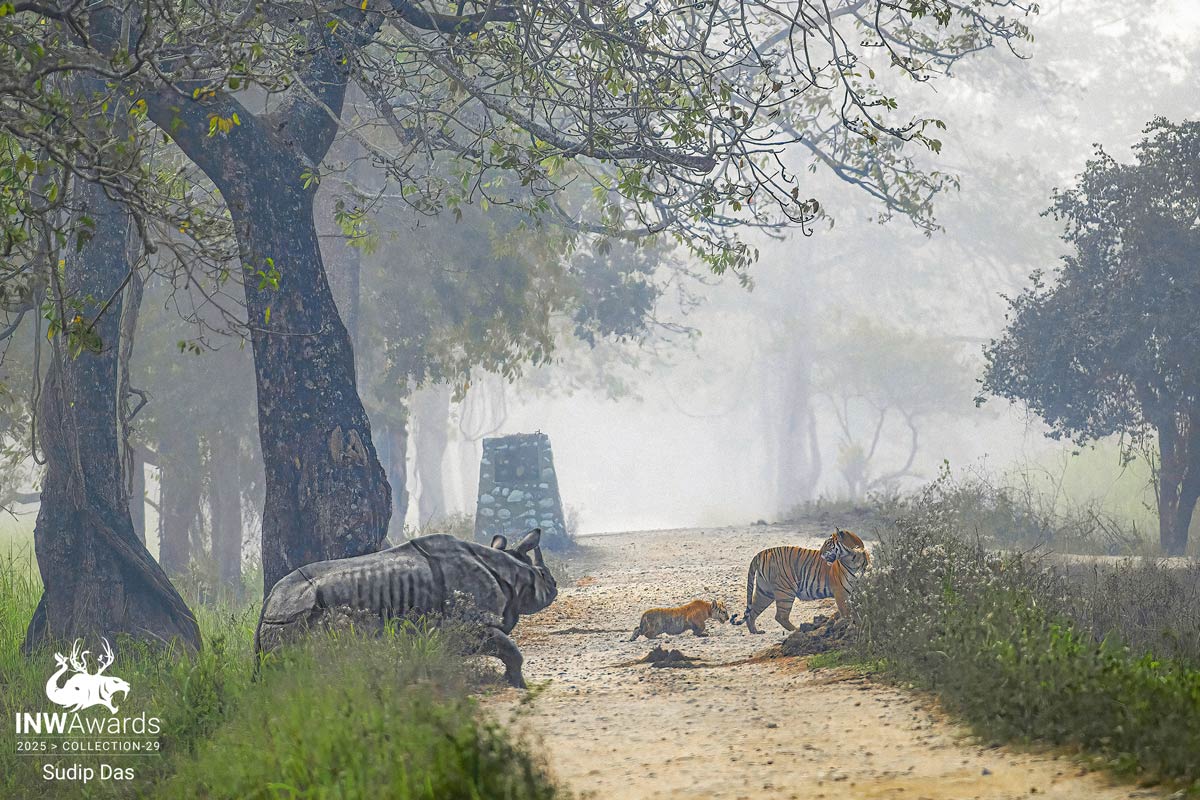 Protective Mother A tigress with her 3 tiny tots came at the center of the foggy trail in Kaziranga National Park, India. Suddenly a huge rhino came in behind from the thicket out of nowhere & was charging towards tiger family. With sense of threat the brave tigress turned back with loud roar and kept cubs behind her. The rhino forced to deviates its direction to avoid conflict. Mother plays a crucial role in protecting her cubs from any kind of potential threat in any situation. This brave and fearless mother is the inspiration for all of us. Not only that all mothers in the world are superhero, and no heroism is greater than motherhood.