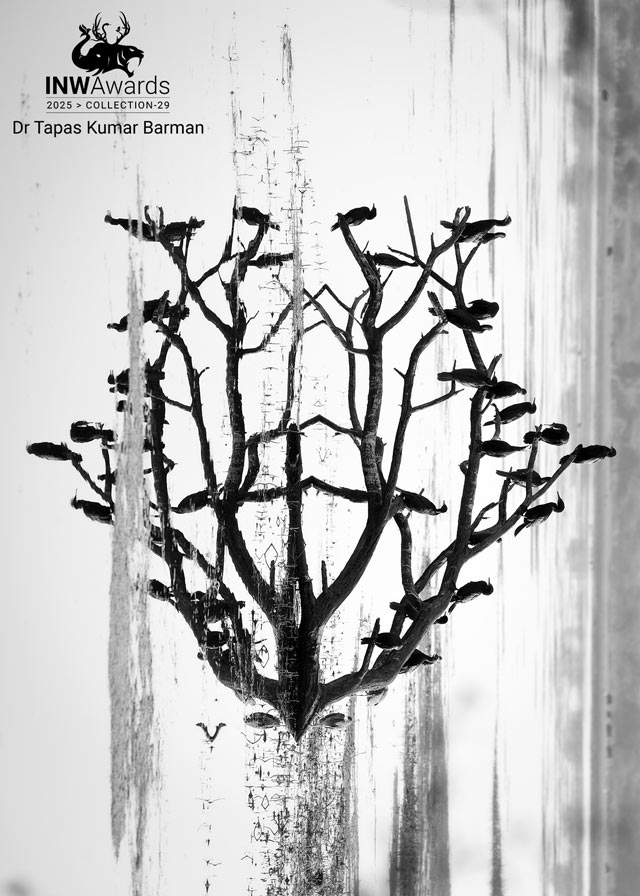 The Cormorant tree ; A striking black-and-white image captures in a dry winter season where a leafless tree adorned with perched cormorants. The image is flipped, creating an illusion where the tree appears to grow downward, blending seamlessly with its mirrored reflection in the water. Place:n Keoladeo National Park, Bharatpur, Rajashthan, India