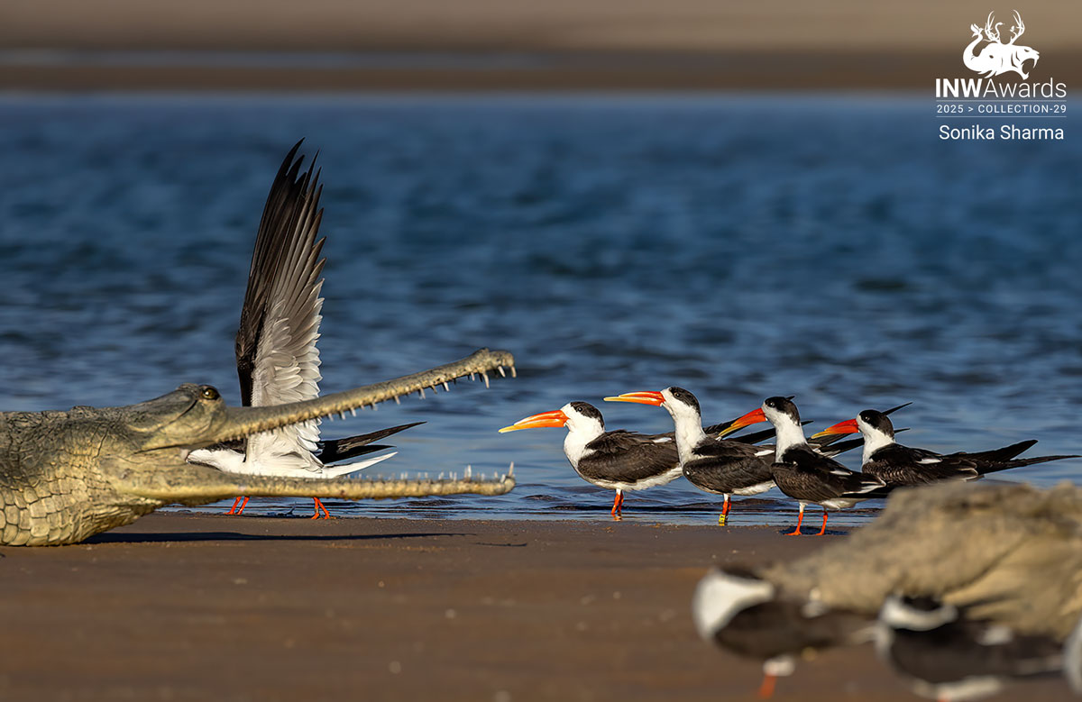 "The Ultimate Face-Off" A dramatic moment at the riverbank—skimmers standing their ground as a gharial's jaws create an illusion of an impending strike. January '25 at Chambal, Dholpur