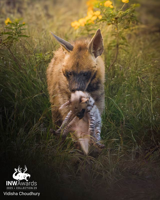Seen here is the image of a Indian Striped Hyena moving amidst the thick grasslands of Bhigwan hiding herself while carrying her cub to safety. Be it Human or Mammals the definition of mother will always be resilience, unconditional love , the purest form of love sacrifice. The weight she carries on her shoulders to ensure that the next generation is nurtured and nourished to stand strong on its own must be the reason behind her undeniably strong stature.