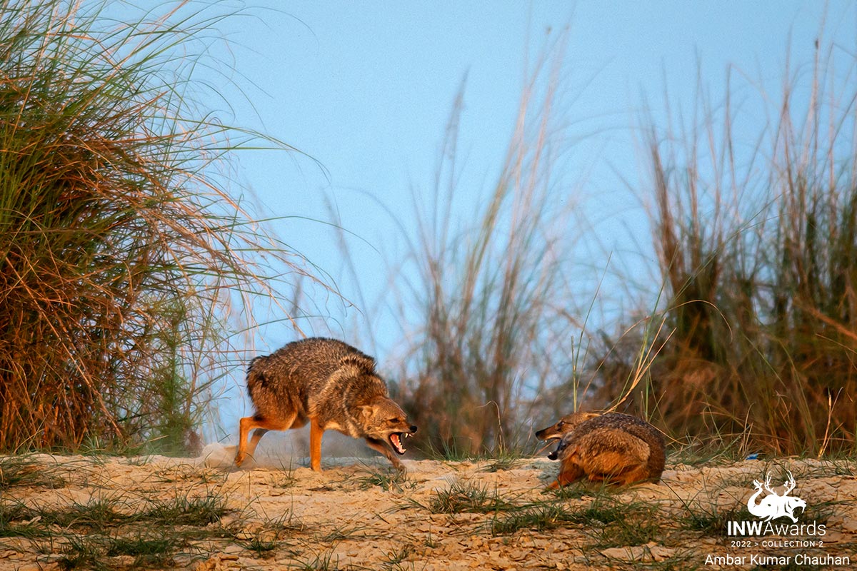 The picture was shot at Purbasthali, West bengal from a boat. I was completely amazed to see an unusual behaviour by Golden jackal. The Jackal was constantly bullying the other, perhaps it was an attempt to persuade the female jackal for mating.