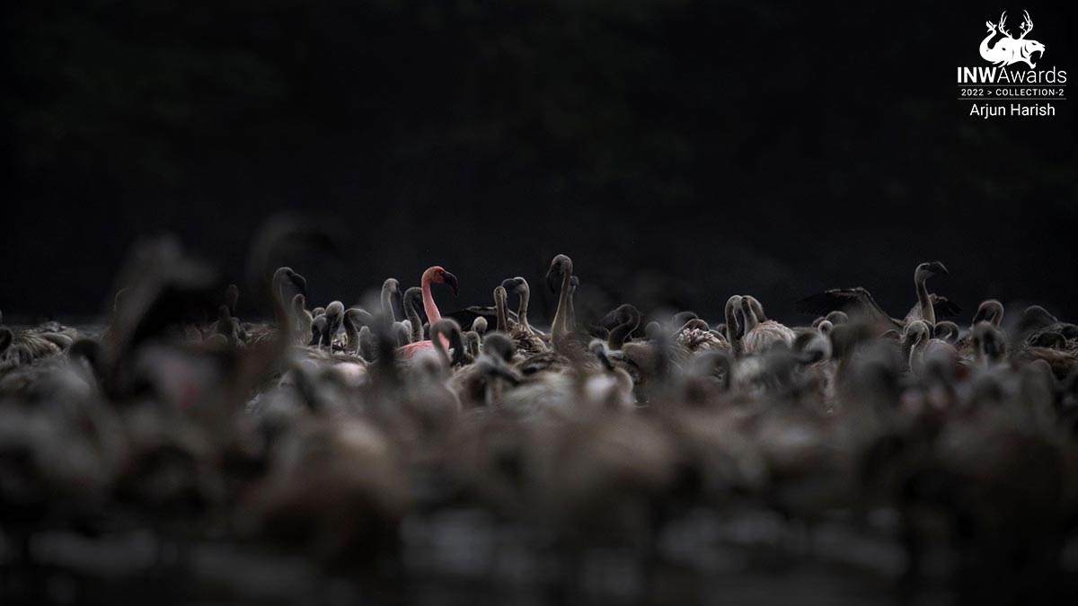 'Pink in a Sea of Grey' An adult lesser flamingo walks among many juveniles. Flamingos get their characteristic colour as they grow from the algae they eat. Taken in the heart of the city, I wanted to convey a sense of depth and show the scale of the migration. The shadowed foliage in the back makes for the perfect backdrop to enunciate the vibrant colours that these birds have. The composition was pre-visualized and I just had to lay waiting for the perfect opportunity.