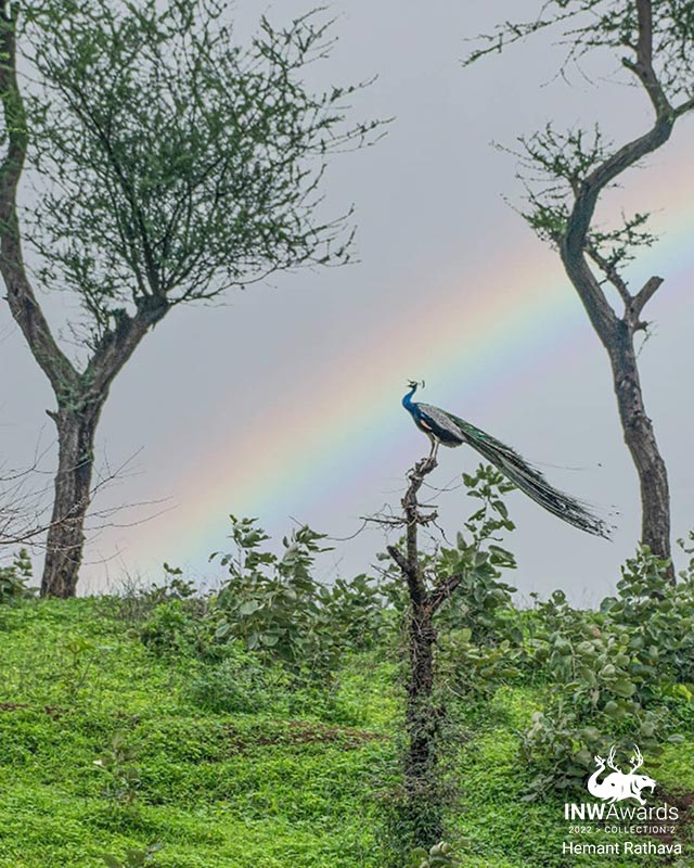 This image is Clicked at Dahod ,Gujarat during Monsoon season where land is covered in green blanket and peafowl is giving a mating call in a clear sky with rainbow.