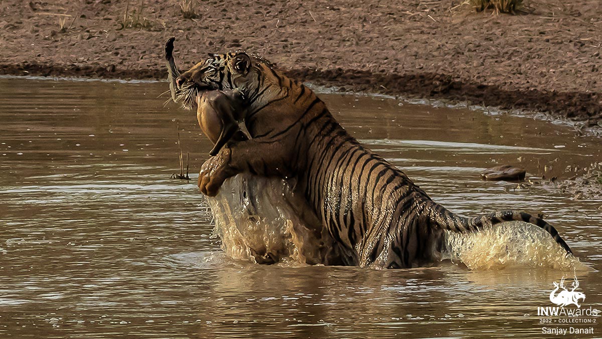 'Mission Accomplished!' A Tiger with a Grey Langur (Monkey) kill. This tiger was a sub-adult cub who killed a Langur and was proudly showing his trophy in a forest waterhole. Location: Bandhavgarh National Park (Madhya Pradesh), India. May 2019. Canon gear.