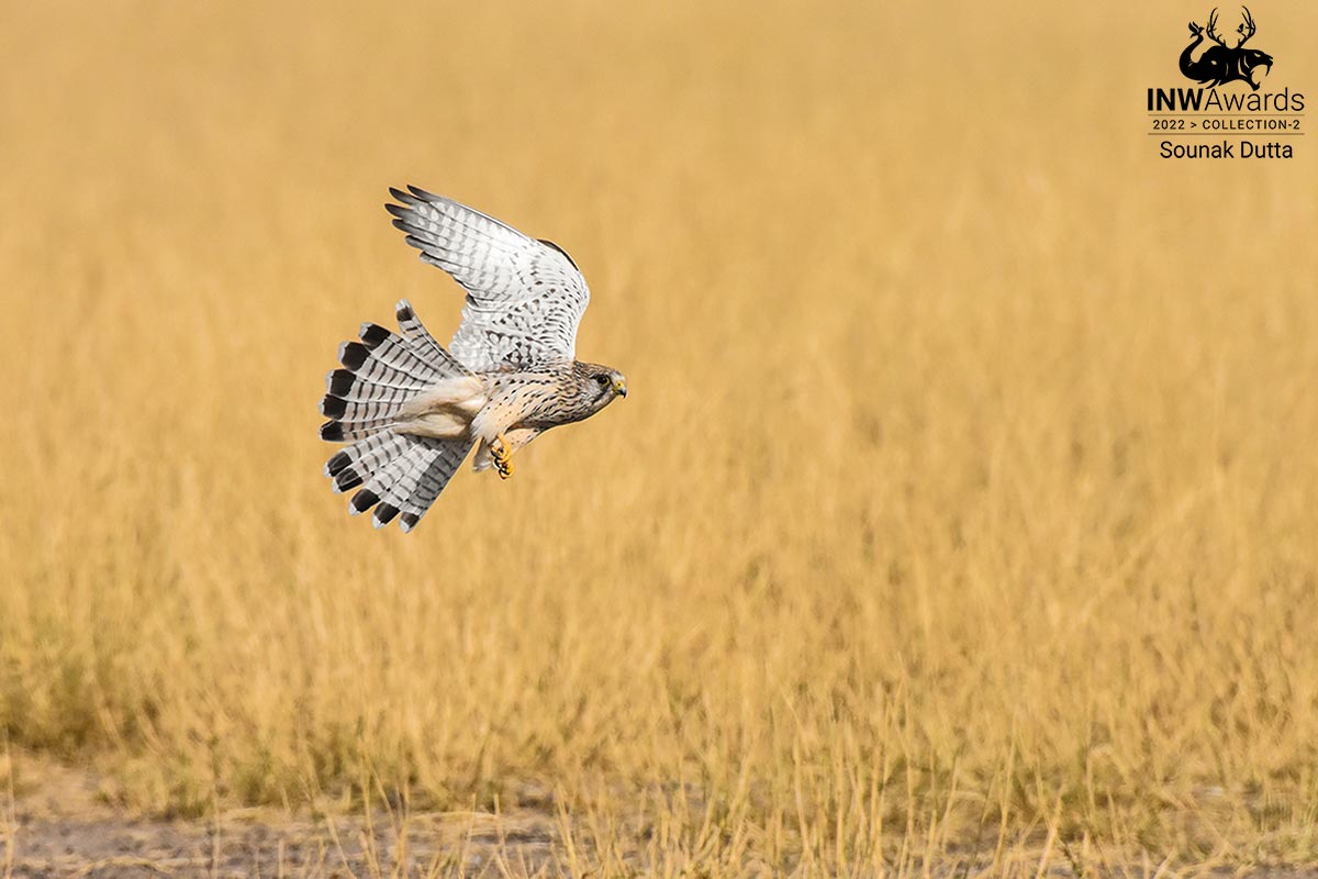 A Common kestrel's afternoon flight, featuring the beautiful grassland of Tal Chapar, Rajasthan