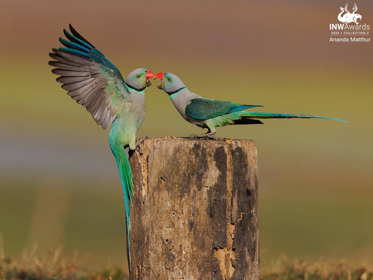 The Breakfast Battle I was all alone in the bird hide, having waited for more than an hour with little success. Suddenly a flurry of activity started, and this pair of male Malabar parakeets started squabbling over the food available. Photographed at a bird hide, Hosanagara, Shimoga district. Food provided by humans - rice husk. January, 2022.
