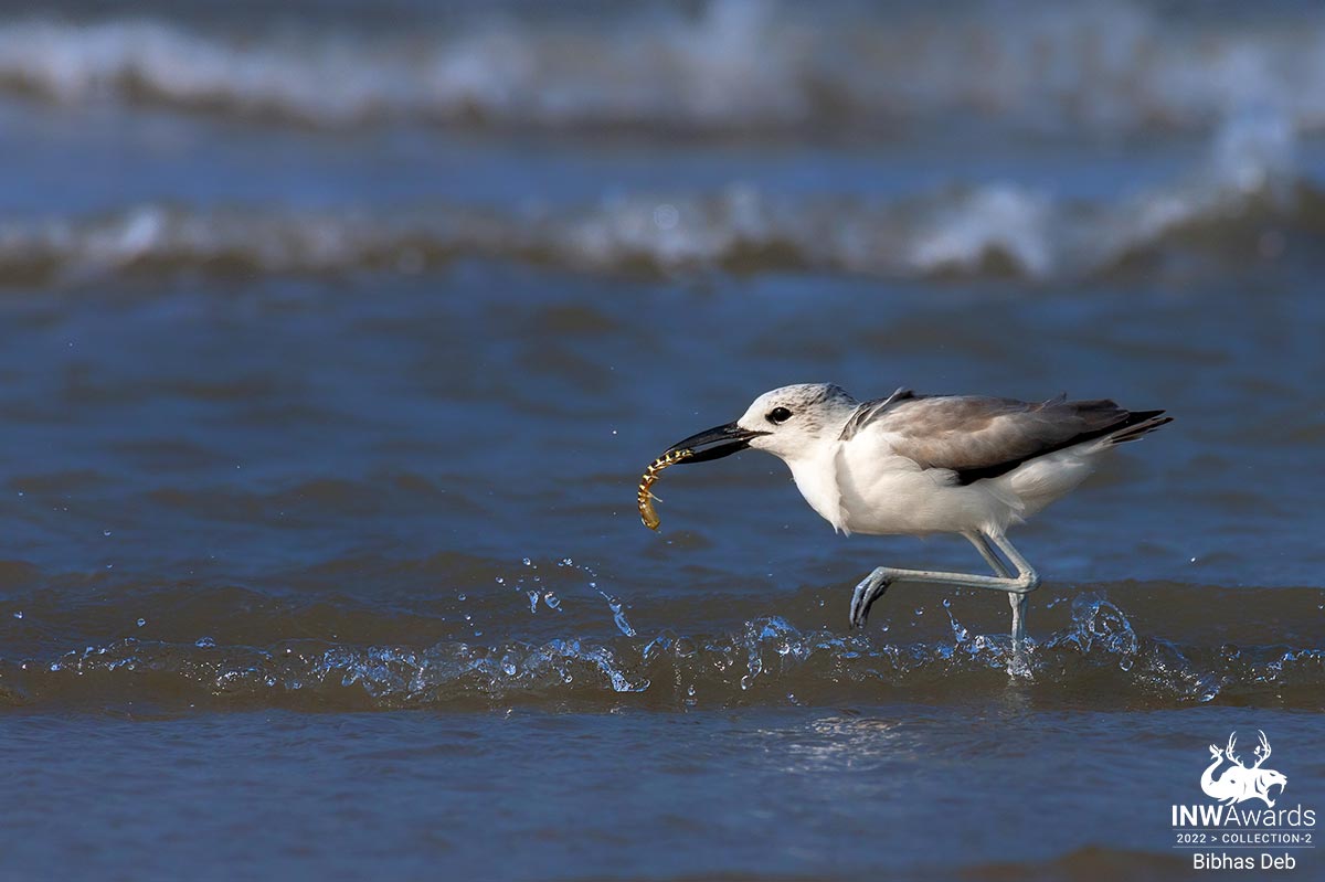 Title: Crab-plover with crab The crab-plover or crab plover is a bird related to the waders, but sufficiently distinctive to merit its own family Dromadidae. This slender shorebird with an over-sized bill subsists on a diet dominated by crabs. I found this moment on the bank of Mandvi beach during my Great Rann of Kutch, Gujarat photographic tour. I was lucky to get this nice habitat shot.