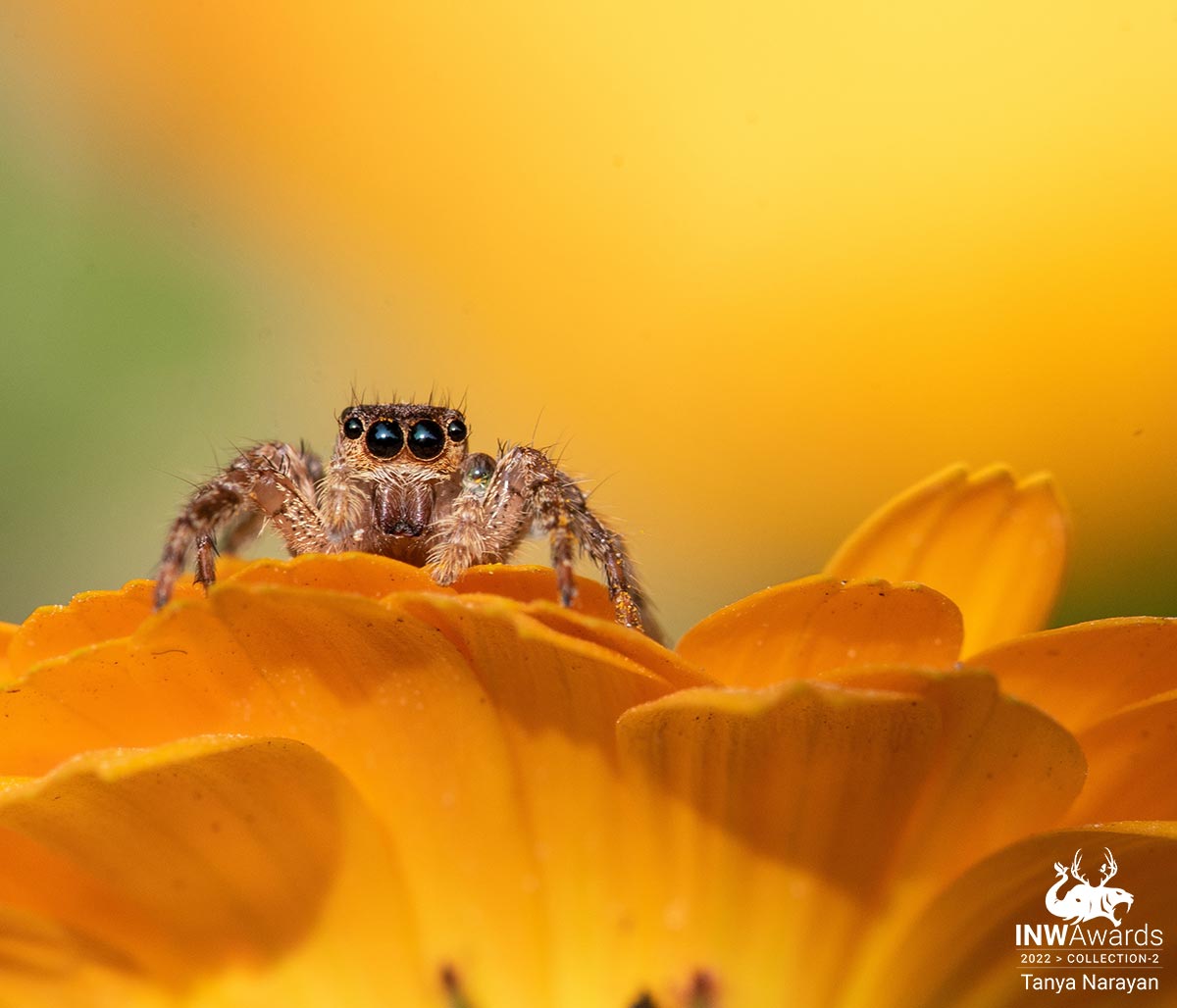Jumping spider. They are the most common species but they are hard to chase. While I was finding the subject to click, I spotted this little spider posing for the camera in my garden. For me, clicking jumping spider in his habitat with so much colors around has been an enthralling one.