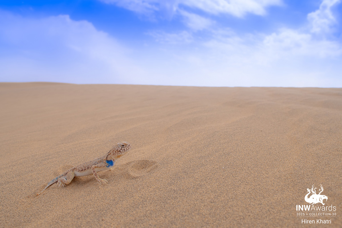 "In a Wide, Wild World" In the vast, sun-scorched landscape of India’s Thar Desert, a male Toad-headed Agama proudly displays its electric blue throat patch—a vivid expression of dominance during the breeding season. Shot using an ultra-wide-angle manual lens, this image places the lizard in dramatic context, emphasising both its scale and the emptiness it calls home. The wide perspective brings out the textured sands and expansive sky, capturing the raw beauty of life surviving in extremes.